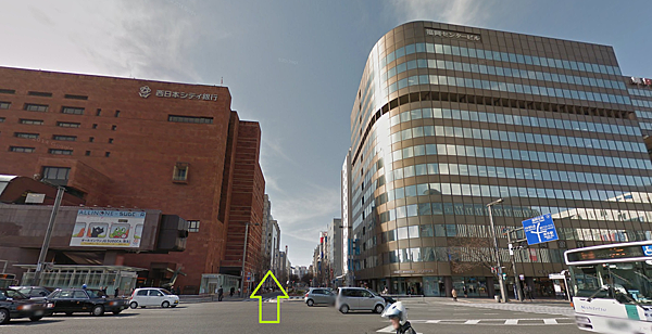 從博多中央口出來後,從這兩棟大建築物的中間這條路走過去